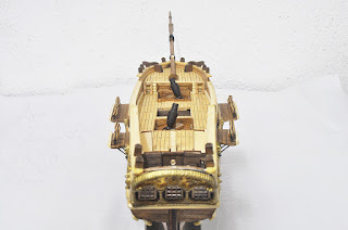 Well, the manual doesn't design ladders to the poop deck from the quarter, but I think it's better to have. Since I don't have enough pre-cut ladder left, I glued the other side directly on the bulwark. Like this:
